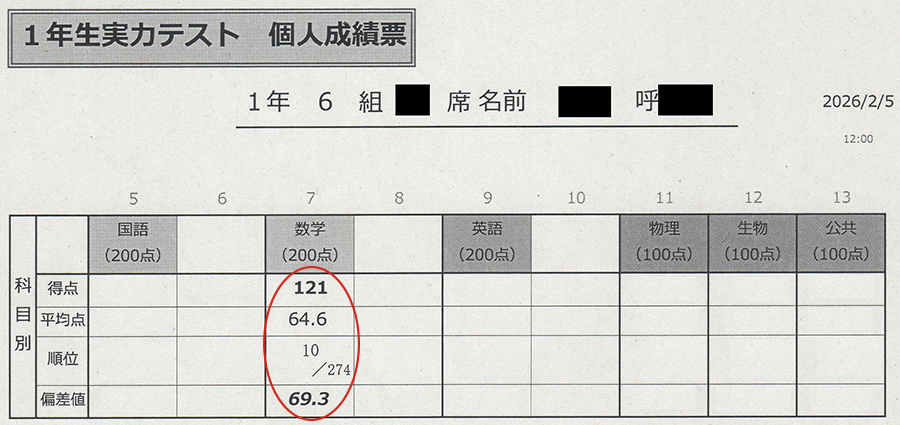松高理数科2年生(2026年2月現在)のKさんは三雲中に入学と同時に青木塾に入塾しました。入塾後、順調に学力を向上させ、無事に松高理数科に合格したのですが、高校入学時に行われたスタディサポートの数学の成績は、282人中226番というとても残念な結果でした。しかし、その後、どんどん数学が得意になり、何と高2の第2回全統模試では学年順位が279人中11番へと劇的に向上しました。