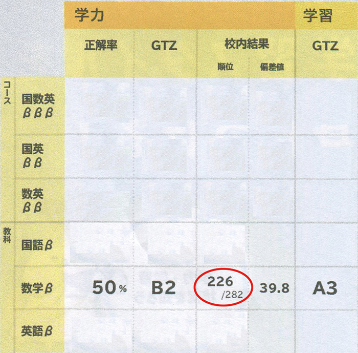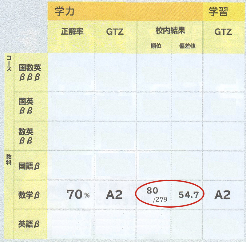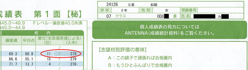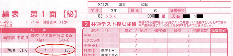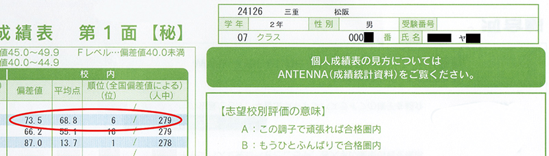 昨年7月に青木塾に入塾した現松高2年生のY君、入塾時に行われたベネッセ総合学力テスト(7月)の成績は、学年順位163番だったのですが、今年8月に行われた第2回全統模試では、学年順位6番になりました。