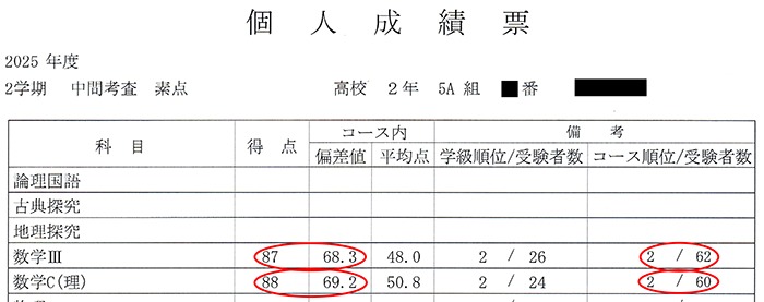 現在、三重高6年制トップ35の高2生のKさんは、三重中3年生になると同時に青木塾に入塾しました。青木塾では高3クラスに所属し、既に数Ⅲ、数Cを一応終え、現在は入試問題の演習をしているところです。上の成績資料は2学期の中間テストの数学の成績ですが、ご覧のように数Ⅲ、数Cの両方において90点近い高得点を獲得し、理系で学年2番となりました。