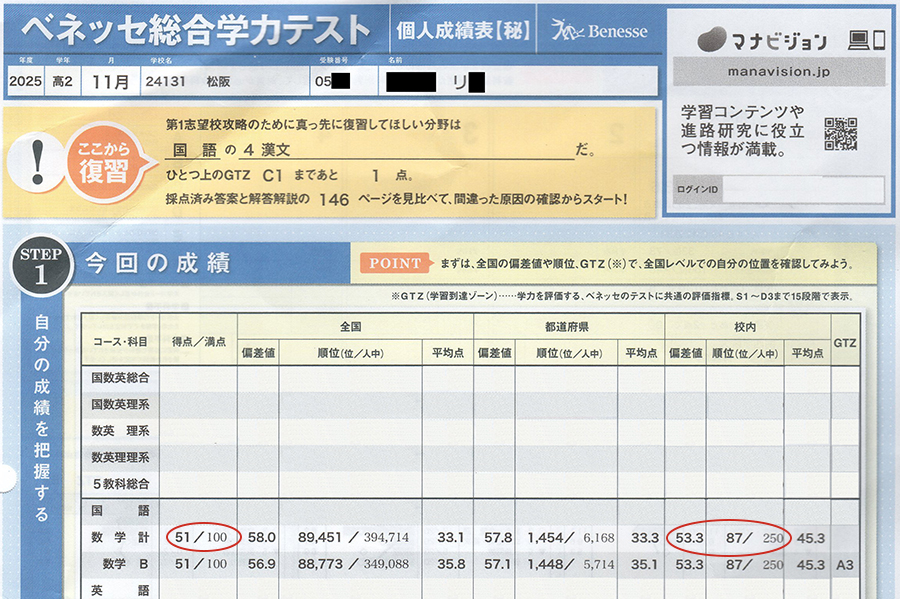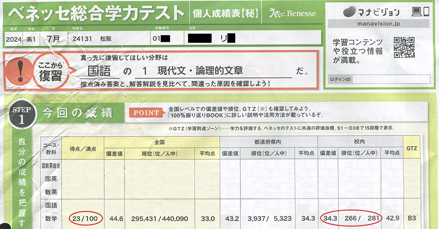 松高2年生(2026年2月現在)のR君が高校に入学して数か月後に受けた進研模試(7月)の数学の成績は100点満点23点、学年順位は最下位に近い281人中266番で、松高の授業には到底ついていけないような成績でした。ところが高2の進研模試(11月)では、点数が100点満点中51点、学年順位は200番近く上がって250人中87番になりました。校内偏差値でも20ポイント近くアップしています。