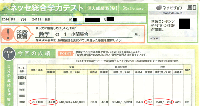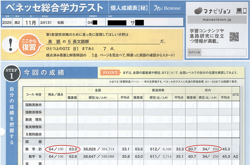 松高2年生(2026年2月現在)のSさんが高校に入学して数か月後に受けた進研模試(7月)の数学の成績は100点満点29点、学年順位は281人中248番で、ほとんど学年最下位に近いといってもよい成績でした。ところが高2の進研模試(11月)では、点数が100点満点中64点、学年順位は250人中34番になりました。校内偏差値では20ポイント以上アップしています。