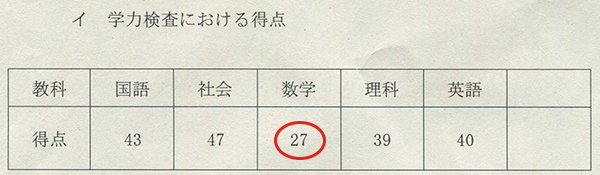下の資料がその成績開示の結果ですが、50点満点中27点に過ぎず、中学の数学が十分に身についていなかったことが伺われます。更にその下の資料をご覧ください。これは高2の秋に返却された第2回全統記述模試の結果ですが、何と文系の受験者133人中4番の成績を獲得しています。